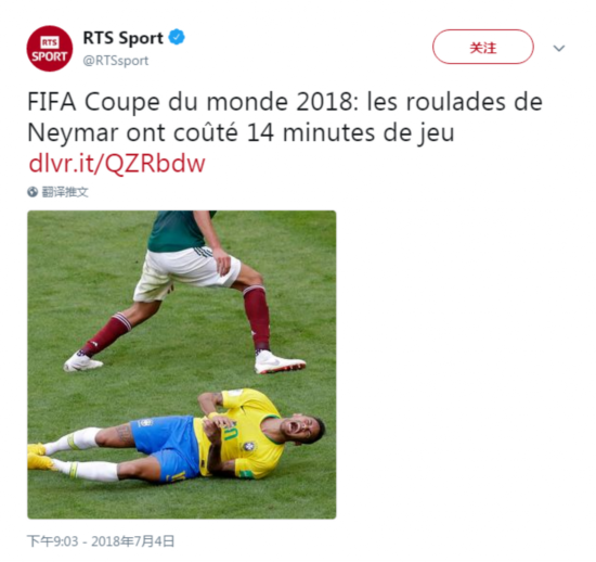 而据法国媒体RTS体育的统计,世界杯4场比赛,内马尔在地上翻滚的时间,足足有14分钟。此外,内马尔与墨西哥的比赛,在地上翻滚的时间最多,一共用时5分30秒。而他被拉云踩了之后,足足翻滚了2分多钟。
