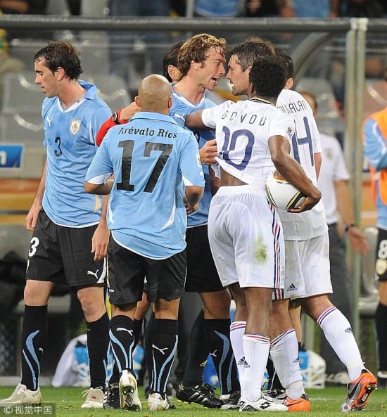 2010年南非世界杯小组赛,法国0-0乌拉圭,法国队再次小组垫底,而乌拉圭则获得小组头名,并最终进入四强。