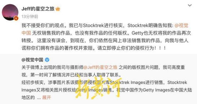 原标题:摄影师发文回应视觉中国:我不接受你们的观点,请立即停止你们的侵权行为 8月16日上午,针对视觉中国此前对于图片版权的回应,摄影师“Jeff的星空之旅”在其个人微博上发文:我不接受你们的观点。我已与Stocktrek进行核实,Stocktrek明确告知我: 视觉中国无权销售我的作品,也没有我作品的任何版权。Getty也无权将我的作品再次转授。 这里没有误会,到现在,你们依然在网上非法销售我的作品,向我与他人谎称你们拥有作品的著作权并索赔。请立即停止你们的侵权行为!!!