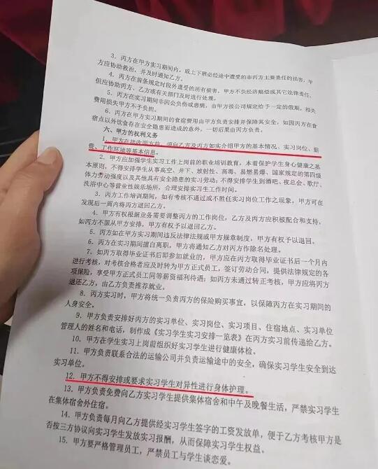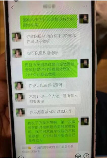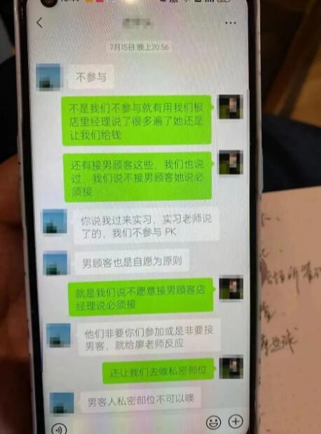 来源 | 潇湘晨报 记者 | 周凌如 据澎湃新闻9月20日报道,重庆一职校女生王糖霏(化名)称,在学校安排的校外专业实习中,被安排给男宾洗澡,保养前列腺,此事引发关注。 据报道,王糖霏就读于重庆开州区职业教育中心美容美发专业,今年7月,她开始校外专业实习,实习单位是永琪护肤造型湖津支路店。王糖霏自述,被门店安排为男顾客洗澡、按摩生殖器三角区进行保养。她称7月15日曾向班主任李老师反映,但是不了了之。今年9月,王糖霏父母来探望女儿得知此事,于是在9月14日向重庆警方报案。 在一份显示校方、学生和实习单位签订的协议中约定,实习单位不得安排或要求实习学生对异性进行身体护理。 根据王糖霏提供的聊天记录显示,7月15日她向李老师反映门店要求接待男顾客,李老师则表示“男顾客也是自愿为原则”、“男客人私密部位不可以哦”。而在王糖霏提供的多份与杨姓门店经理的聊天记录显示,她曾向对方反映为男顾客“洗澡做臀”一事,经理称“你可以选择报警,不愿意做可以离职”、“不是让你一个人做,是所有人都要去做”。王糖霏表示,曾被男顾客“摸了”,经理回复“你当时是跟我说了,那我当时就要跑进去把这个顾客打一顿吗?” 而一份重庆警方出具的报警回执单显示,该店存在管理不规范、未按照洗浴场所管理等问题,并将店主带回派出所调查。 9月21日,记者联系到上述永琪护肤造型湖津支路店的一名工作人员,他表示该门店不提供王糖霏所说的服务,“如果有的话,我们肯定会被要求停业整顿,现在我们还在正常经营。” 该工作人员认为,“王糖霏是因为被经理骂了,才会那样说,家长教她的。学校和派出所都来过,没有这回事,之后我们会去法院起诉,告她诽谤。” 重庆公安局两江新区分局鸳鸯派出所的一名工作人员告诉潇湘晨报记者,目前此事仍在调查中,不便透露。 记者联系到重庆市教育委员会的一名工作人员,她表示“相关情况已经在汇报了,已经在处理了。” |