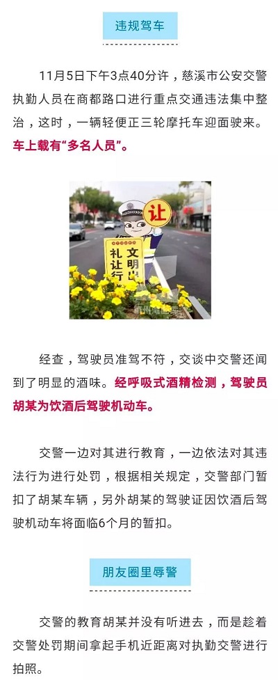 “对不起。我以为是我自己的朋友圈,发一下没有关系的。”拘留所里,胡某面对进入审讯室的民警这么说道。 目前,胡某因寻衅滋事被行政拘留了,事情是这样的…… “当时我看到胡某拿出手机对着同事时,我还提醒他,不要妨碍我们正常执法,更不要断章取义进行传播,引起其他群众的误解。”张警官告诉记者。 这边,交警刚暂扣了胡某这车辆,那头,胡某便立刻将照片传到了自己的微信朋友圈中,并配上了侮辱性极强的文字。 后果很严重 当天晚上交警收到了胡某这则朋友圈的截图照片,经执勤交警初步核实,发朋友圈的人正是当天下午因交通违法被处罚的胡某,就将此案移交至派出所进一步处理。 (网络配图) 11月6日,派出所民警励警官根据走访调查锁定了胡某的暂住地,并将胡某抓获。 “胡某的微信朋友圈里有300多名好友,其中一位朋友还评论提醒胡某将这一侮辱性言语删除,但是胡某并没有听。”根据《治安管理处罚法》相关规定,胡某被处以行政拘留7日的处罚。 |