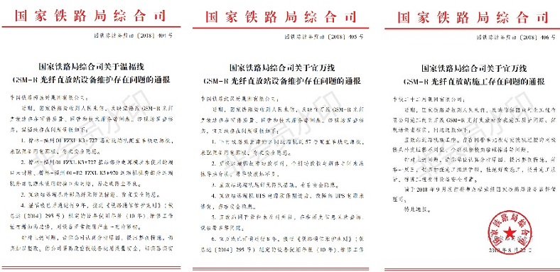 国家铁路局综合司 国铁综设备监函[2018] 403号 国家铁路局综合司关于温福线和宜万线GSM-R直放站存在问题的通报 南京泰通科技股份有限公司: 近期,国家铁路局收到人民来信,反映你单位在中国铁路南昌局集团有限公司温福线和中国铁路武汉局集团有限公司宜万线提供的TGZ-R型GSM-R模拟光纤直放站存在硬件质量、网管和技术服务问题。经现场调查核实,相关问题通报如下: 1.温福线运营初期直放站远端机主控板、接口板故障率较高。温福线2009年开通运营初期,直放站远端机主控板、接口板故障率较高,作为设备供应商,不能主动了解现场情况、解决问题,虽经2012年整治后故障率降低,但自2016年至今,故障率相较往年有所增加;宜万线2017年至2018年6月发生远端机主控板故障17件,对设备正常使用产生影响。 2.温福线运营初期直放站远端机UPS电源故障率较高。温福线2009年投入使用时远端机配置了UPS电源,故障率较高,易造成远端机供电中断,网管上报脱管告警。 3.温福线GSM-R直放站网管系统历史告警可以正常查询,但告警过滤规则不完善,存在无用告警信息、误告警信息过多的问题;系统自动统计大量持续数秒告警,实际告警并不在网管系统上报,虽然设备工作状况正常,但每月告警统计均在2000条以上,误告警信息量较大,造成告警信息分析工作量大。 4.温福线樟林-福州01-R2 FZXL K5+970远端机机房、宜万线鲁竹坝二号隧道内远端机光远184号,供电连接线采用焊接方式,更换时需要使用电烙铁,不如螺丝固定方式或插接式方便,给现场维护带来不便。 5.温福线樟林-福州01-R2 FZXL K5+970远端机机房、宜万线鲁竹坝二号隧道内远端机光远184号,电源模块端子较多,虽采用螺丝固定、连接强度较高,但更换时不如插接式方便,给现场维修带来不便。 6.温福线樟林-福州01-R2 FZXL K5+970远端机机房,存在功放板距离电源线和尾纤距离较近的问题,尾纤易产生高温老化。 7.直放站远端机内部设计较为紧促,更换光模块时需要拆卸动环模块,给现场维护带来不便。 8.宜万线GSM-R直放站网管系统早期版本软件存在操作频繁或鼠标点击频率过快时,有死机现象。 针对上述问题,请你单位认真分析原因,提出整改措施,并举一反三,对使用你单位设备的其他运营线路进行回访,及时发现问题、解决问题,确保设备正常使用。 请于2018年9月底前将整改措施和回访情况报国家铁路局设备监督管理司。 特此通报。 国家铁路局综合司 2018年8月22日  同日,国家铁路局对涉及使用南京泰通提供TGZ-R型GSM-R模拟光纤直放站的单位中国铁路南昌局集团有限公司、中国铁路武汉局集团有限公司、中铁二十二局集团有限公司对于施工及设备维护存在问题进行了通报。