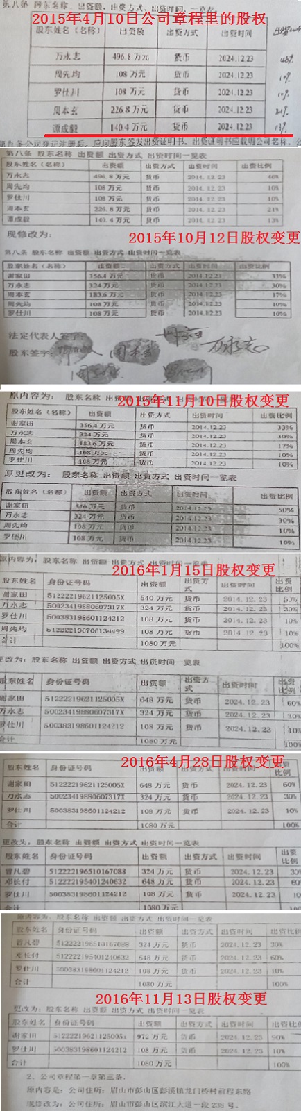 重庆开州区知名企业家疑遭套路骗,致公司破产 独立撰稿人 李海波 谢家田是重庆市开州区知名企业家,创办有重庆旭日建设工程( 集团) 有限公司、 重庆尊诚房地产开发公司、 重庆市开县创品小额贷款有限公司、 重庆尊诚能源投资(集团) 有限公司;是开县人大代表;曾先后获得了“首届开县民营企业家”、“企业文化先进个人”、“开县返乡 创业贡献奖”、“重庆优秀建筑企业经理”、“重庆市知名企业家” 称号。 近日谢家田向撰稿人讲述2015年受开州老乡的蒙骗收购四川长寿坊房产项目而陷入困境,公司破产了,自己也被列入失信人...... 高利贷者 入主四川长寿坊房产后拉谢入伙 2014年1月27日,四川飞洋置业有限公司,法人代表周先均,(以下简称飞洋公司)与四川省彭山县政府签订《华润万家彭山商业综合体及体育公园配套项目投资框架协议》,双方就该项目的位置、规模、土地达成框架协议。2014年8月20日,飞洋公司与重庆君宏信用担保有限公司达成《协议书》,由君宏公司出资3000万元收购彭山项目,2014年9月10日,飞洋公司与彭山县政府订立《中国长寿坊商旅综合开发项目投资协议书》,由飞洋公司出资在彭山县彭祖新城规划区内打造高档商住旅游特色街区。2014年11月27日,飞洋公司拍得PP2014-6号地块,面积107.65亩,土地出让金1.4555亿元,与彭山国土局签订《国有建设用地使用权出让合同》,飞洋公司交纳土地出让金及服务费2850万元。 1988年出生的开州人万永志是重庆君宏投资担保公司的法人,和铁桥镇国土所所长谭成毅从事高利贷业务2015年4月10日,他们和周本玄、周先均、罗仕川5人出资1080万在眉山市彭山区注册成立四川长寿坊房地产开发有限责任公司(以下简称长寿坊公司)法人代表万永志,父亲万录山(区畜牧局干部,长期吃空饷)担任董事长、总经理罗仕川,周本玄儿子周宇航担任出纳。而5人无开发房产经验,和谢家田熟悉的周本玄于2015年8月开始多次联系上开州区知名房产企业家谢家田,希望其合作开发该项目,他们负责筹钱,谢家田只负责开发。 周本玄等5人采取虚假宣传彭山区项目的规划,如容积率、周边配套如公益设施等,还私刻公章、伪造公文出示宣传。还向谢家田介绍宣传项目地块下面是砂石,价值2千多万元,可在挖建时利用产生巨大经济收益。 其实5人早在2015年5月6日将此收益以合同形式发包给四川瑞柯建筑有限公司,并向其支付15元/立方的土石方价款。不但无收益还反倒支付巨资,这真是说不通的做法。 5人将1080万元的长寿坊公司做账成5200万元,在4月10日注册时就已经形成,因为万永志购买项目时向周本玄借款1400万元无力偿便在当天以债转股形式给周本玄“到约定归还时间无钱,找周本玄协商,将其用于购买这款土地未溢价的5200万元按百分比计算转让股权作为支付下欠周本玄款项的抵债。当时周本玄考虑到有几百万元资金要及时归还给别人,就承担受让万永志21%的股权x5200万=1092万元的股本金,除去受让股权折股金后,还下欠308万元资金,由万永志向周本玄出具不等时间的借条。”而原会计杨兆沛移交的账册显示,4月10日后该项目产生的费用近2千万元。 2015年9月20日,周本玄、万录山、谢家田签订长寿坊公司合伙协议,显示长寿坊开发眉山市彭山区彭祖新城约800亩土地,约定谢家田投资2756万元占股53%,万录山投资2756万元占股30%,周本玄投资884万元占股17%,当日周宇航给其出具一张收据“今收到谢家田股本金2756万元”,该收据盖有公司公章和财务章。 2016年春节,万录山、周本玄又指示长寿坊原工作人员吴本高悄悄将公司虚假公文等重要资料取走。3个月后,吴本高又病逝。至今,这些重要资料下落不明。 签订的合伙协议,谢家田占53%股份在10月12日的公司章程中却只有33%股份 群狼齐上 写下多张借条后身不由己 谢家田加入长寿坊签订合伙协议后,一系列事情冒出来了,股权一下猛增为131%。先是四川飞洋公司周先均出面拿出协议,说长寿坊欠他3千万元和占有10%股份和公司10%利润。奇怪的是,长寿坊公司花费了这么多钱,但主要的土地出让金却没有缴纳,万永志仅支付了飞洋公司300万元保证金。 于是在2016年1月15日,飞洋公司与长寿坊公司谢家田订立《协议书》,由长寿坊公司支付飞洋公司3000万元,谢家田支付周先均10%干股,长寿坊公司10%利润为周先均顾问费。 频繁的股权变更 而后谭成毅也说有720万元占股13%,但原始账册显示其只有597.6万元,其提供给法院的银行流水多少转给周本玄,属于二人之间的经济往来。 之后长寿坊会计杨兆沛也出面说占公司股份1%,各原股东认可后谢家田又向杨兆沛出具52万元的借条。 10月12日,长寿坊公司章程修正案,将第8条股东名称等修改为:谢家田出资356.4万元占股33%,万永志出资324万元占股30%,周本玄出资183.6万元占股17%,周先均出资108万元占股10%,罗仕川出资108万元张10%。出资时间为2014年12月23日。 2015年11月10日,长寿坊章程修正案,显示周本玄将持有17%股份转让给谢家田,此股权1092万元谢家田履行完毕。据此谢家田占股50%,万永志占股30%,周先均占股10%,罗仕川占股10%。出资时间为2014年12月23日。 2016年1月13日,谢家田给廖代华出具220万元的借条,显示是万录山股权转让款中减除。 2016年1月15日,长寿坊章程修正案,显示周先均将持有10%股份转让给谢家田。据此谢家田占股60%,万永志占股30%,罗仕川占股10%。出资时间为2024