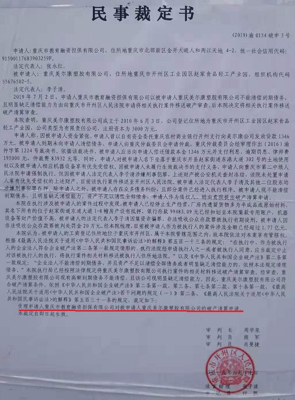 2019年7月17日,开州区法院裁定,受理申请人对美尔康公司的破产清算申请。而提请执转破的教育融资担保公司也是之前申报过的债权人,法院为何要单独受理该债权人的民事诉讼?难道250多名3000受害人都另行进行民事起诉来讨回自己的钱么?!如此一来,之前刑事判决的返还受害人财产岂不是一纸废话?!  2019年9月6日,开州区法院发布公告,要求债权人进行债权登记。 这样做,那前几年公安局、检察院、法院确认的债权人岂不是无效,他们做了无用功?!岂不是推翻了重庆市开州区人民法院(2017)渝0154刑初436号判决书?! 李子清及美尔康公司众多债权人表示对此非常失望,并将对此抗争不止。撰稿人将进一步关注此事件!