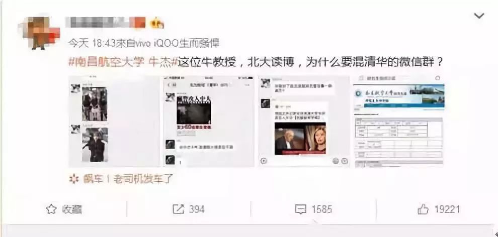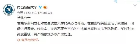 13日,社交媒体上有人爆出一位账号为“牛杰5号”的网友在微信群组中发表涉香港不当言论的多张截图,引发舆论关注。该网友在群组中称“所谓暴徒都是孩子,他们没有整死一个人”。有网友对比表示愤怒。 南昌航空大学微博截图 特此公告 首先感谢网友们对南昌航空大学的关心与帮助。在看到相关信息后,我校第一时间进行调查。经核实,发表不正当言论的牛杰确系我校文法学院教师。学校对此高度重视,将严格依规予以严肃处理。 13日,社交媒体上有人爆出一位账号为“牛杰5号”的网友在微信群组中发表涉香港不当言论的多张截图,引发舆论关注,有网友表示愤怒。 微博截图 图自微博