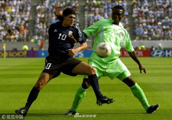 2002年6月2日,韩国釜山,2002韩日世界杯小组赛,阿根廷Vs尼日利亚。 克雷斯波与尼日利亚球员拼抢。