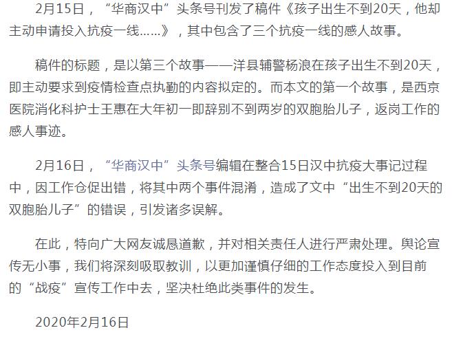 华商报,你们的新闻节操在哪儿 独立撰稿人 李海波 2月15日,“华商汉中”头条号刊发了稿件《孩子出生不到20天,他却主动申请投入抗疫一线……》,其中包含了三个抗疫一线的感人故事。新闻是这样写的:“老公,你开车送我回西安吧,早上8点我要准时.上班。"大年初一凌晨3点,王慧将出生不到20天的双胞胎儿子哄睡后,让丈夫雍波开车将她从洋县送回西京医院。年初一早.上6点30,雍波将妻子安全送到西京医院门口。“你好好上班,保护好自己,我赶紧回呀,不然孩子看不到我们会哭。”话音未落,雍波掉转车头就往回赶。10点左右,经过7个多小时的长途驾驶,雍波安全到家,刚起床不久的两个孩子稚气地问:“妈妈王嘛去子2“雍波哄着说:“妈妈. 上班班了,回来给你们买糖糖。" 16日深夜,华商报致歉书给出的解释是:稿件的标题,是以第三个故事——洋县辅警杨浪在孩子出生不到20天,即主动要求到疫情检查点执勤的内容拟定的。而本文的第一个故事,是西京医院消化科护士王惠在大年初一即辞别不到两岁的双胞胎儿子,返岗工作的感人事迹。2月16日,“华商汉中”头条号编辑在整合15日汉中抗疫大事记过程中,因工作仓促出错,将其中两个事件混淆,造成了文中“出生不到20天的双胞胎儿子”的错误,引发诸多误解。 对此致歉,撰稿人还是不服:一是文章内容本来是洋县辅警杨浪在孩子出生不到20天即要求执勤,事实属实么?坐月子中就要求上岗,这真是不要命啊?二是致歉书里写的“2月15日,“华商汉中”头条号刊发了稿件《孩子出生不到20天,他却主动申请投入抗疫一线……》,其中包含了三个抗疫一线的感人故事。”也就是说文章是2月15日发布的,但这里又说“2月16日,“华商汉中”头条号编辑在整合15日汉中抗疫大事记过程中,因工作仓促出错,将其中两个事件混淆......”你们工作严谨点好不?三是《孩子出生不到20天,他却主动申请投入抗疫一线……》文章中包含了三个抗疫一线的感人故事,但是看看发的那文章《孩子出生不到20天,他却主动申请投入抗疫一线……》编号是7,下面还有“8.再发力,汉中市市场监管局......”华商报,一个谎话十个圆,圆谎掰下手指头算算再圆好不好?! 既然这么多感人事例,为何没有图片?有记者现场采访吗?!新闻的生命是真实!没有事实就没有新闻,事实是新闻的生命。新闻的特点就是真实性、及时性、准确性!一篇新闻出笼,需要记者采写,编辑,责任编辑、主编、值班总编审核这一系列留存才会发布,这么多人把关,却管不住这一篇笑掉大牙的烂文?! 华商报,你们的的社会责任感哪去了?! -------------------------------------------------------------------------------------------- 附华商报致歉书附后的2月15日,“华商汉中”头条号刊发稿件【原稿虽然删除,但网友截图显示有8,呵呵】 《孩子出生不到20天,他却主动申请投入抗疫一线……》原文 1)“女儿,家里有我们照顾,医院需要你” “老公,你开车送我回西安吧,早上8点我要准时上班。”大年初一凌晨3点,王惠将双胞胎儿子哄睡后,让丈夫雍波开车将她从洋县送回西京医院。 王惠和雍波都是洋县龙亭镇杜村人,王惠在西京医院消化科当护士,雍波在西安创业,父母在西安帮她们照顾不到2岁的双胞胎儿子。腊月二十九,雍波一家回到洋县老家过年,同时走访多年未见的亲戚朋友,正月初八给孩子过生日。 但计划赶不上变化,新冠肺炎疫情爆发。正在吃年夜饭的时候,王惠突然接到医院上班的通知,一切计划全部泡汤。 “女儿,家里有我和你爸还有雍波,医院需要你,你赶紧回,路上小心点。”婆婆的一番话成为王惠强大的精神支柱。 夫妻两行车3个多小时,行程230多公里,平时繁忙的西汉高速,竟然没有碰到一辆车。大年初一早上6点30,雍波将妻子安全送到西京医院门口。“你好好上班,保护好自己,我赶紧回呀,不然孩子看不到我们会哭。”话音未落,雍波掉转车头就往回赶。10点左右,雍波安全到家,刚起床不久的两个孩子稚气地问:“妈妈干嘛去了?”雍波哄着说:“妈妈上班班了,回来给你们买糖糖。” 2)“儿子,等爸爸打完病毒小怪兽就回来陪你玩” “过年别人家小孩的爸爸都回来了。爸爸,你什么时候回来啊?”大年初二下午5点,正在西汉高速洋县出口疫情检查点执勤的李铎接到2岁小儿子的电话,眼眶湿润了。 李铎是江南中队中队长,中队负责的检查点是洋县重要的交通枢纽,仅大年初二就有4000多辆来往车辆。“要扎紧这个‘铁闸栏’,严防疫情向洋县扩散,不获全胜,决不收兵!”李铎立下了军令状。 李铎老家在勉县,妻子在勉县陕钢集团上班,7岁的大儿子和2岁的小儿子都留在勉县让父母照顾,母亲有糖尿病,父亲心脏也不好。今年,李铎本打算回勉县和家人团团圆圆过个年,而突如其来的疫情打乱了他的美好愿望。 “儿子,等爸爸打完病毒小怪兽就回来陪你玩,在家听爷爷奶奶话,爸爸爱你。”2月12日,李铎抽空和儿子通了一会电话。挂掉电话后,他翻开检查点的记录本,上面写着:“截止2月12早上8点,共排查车辆21329辆,体温检测28408人,未发现疑似人员。” 3)孩子出生不到20天,他却主动申请投入抗疫一线 “队长,疫情防控任务艰巨,我申请明天回来上班。” “你的孩子出生还不到20天,家里的事你能安排好吗?” “请队长放心,没有大家哪有小家,我妻子和父母都很支持我的决定。”大年三十,洋县金水中队辅警杨浪听说队友在西
