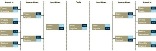 一开始,高盛选择德国在决赛中对阵巴西,但看到德国开局失利,而英格兰轻松两连胜后,他们认为进入决赛的会是英格兰。