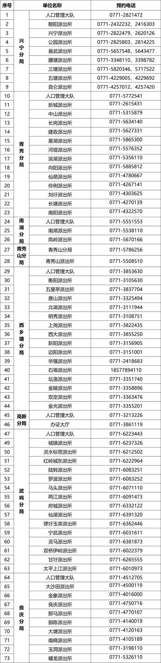 @需要办理户籍业务的你 注意啦 自2020年3月2日起 南宁市公安机关户籍窗口 恢复线下(现场)业务办理!!! 关于恢复全市公安机关 户籍窗口线下服务的通告 根据市委、市政府关于疫情防控工作和有序复工复产工作的部署要求,我市公安机关户籍窗口自2020年3月2日起恢复线下(现场)业务办理。现将有关事项通告如下: 一、实行预约办理。疫情防控期间,需要到现场办理业务的群众可通过电话预约或现场预约的方式提前预约办理时间,并按预约时间到现场办理,超时未到现场办理的需重新预约办理,避免不必要的人员聚集。城区内预约时间为工作日:9:00—12:00,13:00—17:00;县域内预约时间为工作日:8:00—12:00,15:00—18:00。 二、倡导网上办理。办理户籍业务、居住证业务可通过登录南宁市公安局网上服务平台户籍板块或使用手机下载南宁市公安局i微警公众版app、关注南宁警方—i微警公众版—户政服务等渠道了解所需材料和在线申办。 三、推行自助办理。广西区内户籍人员的居民身份证补换领业务可以到市公安局警务工作服务站的公安综合业务一体机和派出所居民身份证自助办理点的居民身份证自助申领机以及广西“警e邮”多合一自助设备自助办理。广西“警e邮”多合一自助设备还可以提供临时身份证明、流动人口居住证明、无犯罪记录证明的打印和居住登记、身份证件寄递、临时身份证办理等多项户政自助服务。 四、做好个人防护。按照疫情防控工作要求,到公安机关户籍窗口办理业务的群众一律使用扫码出入。出入人员需正确佩戴口罩,并配合工作人员进行身份核验和体温检测。有发热、咳嗽、乏力等体征异常的,暂不允许进入公安机关户籍窗口区域。 五、办理业务时,要保持安全距离并配合现场工作人员进行人员分流管理。请提前准备相关材料,即办即走,减少停留时间,最大限度降低交叉感染风险。 南宁市公安局人口管理支队 2020年3月1日 南宁市公安机关 户籍窗口预约电话 疫情防控期间,请市民朋友优先使用网上办、自助办、掌上办等办理方式。确实急需办理且无法使用网上办、自助办、掌上办进行办理的业务,请市民朋友在工作时间拨打户籍窗口电话预约办理。非急需办理业务的市民朋友,建议待疫情解除后再办理。 ![]() ![]() ![]() ![]() 居民身份证自助办理点 南宁市公安局设置了居民身份证自助办理点,并在市区警务工作服务站配备了公安综合业务一体机,为广西壮族自治区内户籍人员提供居民身份证换、补领的自助办理服务。 ![]() 南宁市公安局 警务工作服务站地址 ![]() 广西“警e邮”多合一 自助设备服务点 ![]() 来源南宁警方、南宁市公安局人口管理支队 |