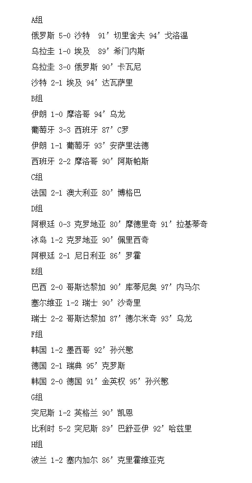 本届杯赛80分钟后出现进球的场次,见下表: