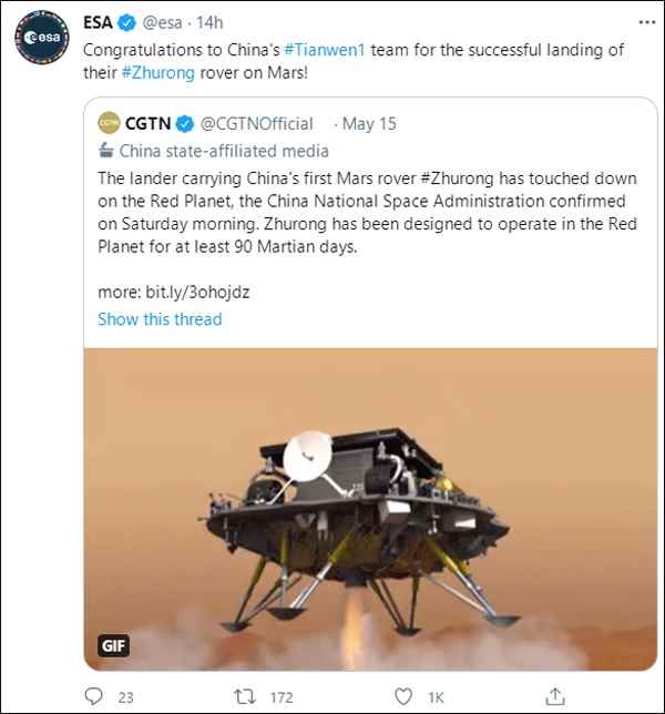 | 原标题:欧洲航天局祝贺“天问一号”探测器成功着陆火星 当地时间15日下午,欧洲航天局在社交媒体平台上转发了CGTN有关祝融号火星车成功着陆火星的报道,并向“天问一号”火星探测任务团队表示祝贺。 ![]() 当天早些时候,欧洲航天局下属的火星探测计划执行团队也在社交媒体平台上发文,向中方表示祝贺,并鼓励“天问一号”火星探测任务接下来走得更远。 今年2月10日,欧洲航天局就曾公开祝贺“天问一号”火星探测器顺利进入环火轨道,并表示在其着陆巡视器软着陆火星表面之后,将利用“火星快车”空间探测器为“天问一号”的环绕器提供数据中继的支持,将火星车采集到的数据传回地球上的地面站。 (总台记者 邹合义 江华) |