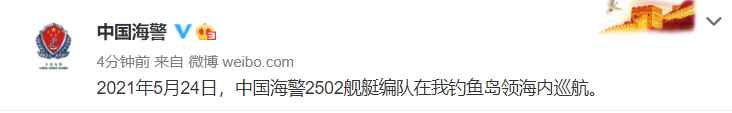 2021年5月24日,中国海警2502舰艇编队在我钓鱼岛领海内巡航。