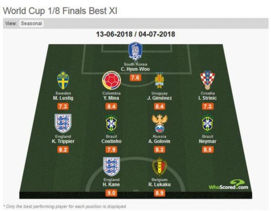 《Whoscored.com》最佳阵容 《Whoscored.com》的这份小组赛最佳阵容使用了4-4-2阵型,得分最高的正是2位前锋凯恩(9.0分)和卢卡库(8.9分),而评分达到8.1分的C罗和评分排名第3的阿扎尔(8.7分)虽然高于库蒂尼奥的7.9分(梅西为7.86分),却也只能因锋线名额太少而被凯恩和卢卡库挤出名单。 中场方面,英格兰的特里皮尔、巴西的内马尔、库蒂尼奥、俄罗斯的戈洛温入选,防线则由瑞典的卢斯蒂格、哥伦比亚的米纳、乌拉圭的吉梅内斯和克罗地亚的斯特里尼奇组成。