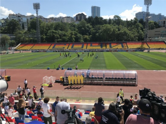 波兰驻地的红色主题 巴西:戏精金丝雀驻场 巴西队把大本营放在了索契,其实他们根本不可能来到这里比赛,但为了让队员能享受到如里约一般的沙滩与阳光,他们还是把基地放在了这座俄罗斯南部城市。 贵为五星战队,也许他们的大本营没有德国或者日本那般细致,但派头绝对是足够的。为了应付封闭式训练和开放式训练的不同要求,他们租下了黑海沙滩边一个拥有两个足球场的酒店。封闭式训练场有着小型的看台,能够容纳足够多的媒体记者。而那个只有全开放式训练才会启用的足球场,则拥有四面看台,可以容纳大量疯狂的巴西球迷进场。