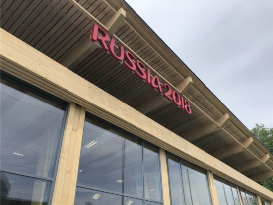 俄罗斯驻地新闻中心 林荫大道走到头是一个丁字路口,路口处有一个五环搭配火炬的雕塑,这就是圆湖基地的入口。圆湖基地之所以出名,也是因为这里是俄罗斯体育的孕育之地,几乎所有冬季夏季项目都是在这里训练。 正是因为这里是俄罗斯体育中的重地,所以整个圆湖基地的安检也显得格外特别。在基地门口有一个关于世界杯的证件通行图示,什么样的证件可以进入到这里,也是有明确的规定。门口的安检也显得很特别,所有出入这里的人无论是工作人员还是媒体或者是运动员都要进行严格的安检,而检查并不是通过安检门,而是一条工作警犬。你要把包放在一个安检的箱子上,打开包,安保人员牵着工作犬过来。工作犬都是德国黑背,它们把鼻子伸进包里一通闻,确认安全后还要在门房让保安全部开包在检查一遍才能通行。