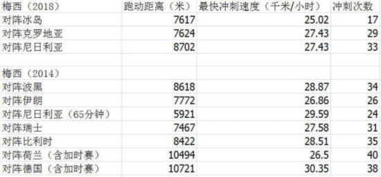 梅西本届世界杯和2014年世界杯的跑动数据对比。 梅西真的懒吗? 本届世界杯,外界一直在诟病梅西的“懒散”,总是在散步而缺乏求胜欲。 但是事实上,我们通过查找2014年世界杯FIFA官方报告发现,梅西在四年前的比赛跑动距离与本届杯赛相差无几。 梅西在巴西世界杯上的7场比赛中,除去一场提前下场和两场加时赛外,有4场是踢满90分钟的,这四场比赛中梅西的总跑动距离为32279米,场均跑动为8070米。 而在本届世界杯上,梅西的场均跑动距离为7981米,与上届平均相差100米不到。 所以说,梅西一直是“散步型”球员,但四年前他这么踢就能带领球队杀入决赛,所以改变的究竟是梅西还是队友? 场均过人和场均射门 先看一张图表: