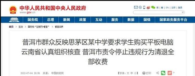 原标题:云南一中学以是否购5800元平板定分班?当地政府:属实 中国政府网7月4日消息,普洱市张先生通过国务院“互联网+督查”平台反映,思茅区第四中学以是否购买平板电脑划分智慧班和传统班,智慧班的学生需要花5800元购买平板电脑。 国办督查室收到相关留言后,经初步核实,及时转有关地方政府核查办理。云南省政府接到国办督查室转办的问题线索后,立即组织开展核查。 经核查,群众反映情况属实。自2020年秋季学期开始,云南省普洱市思茅区第四中学以是否购买平板电脑为依据,将新入学的七年级学生分为智慧班和普通班,要求14个智慧班的719名学生按照5800元/套标准购买平板电脑、配套设备及资源服务。截至督查时,719名学生已每人缴纳3400元(包括平板电脑、配套设备及第一学年资源服务费),收费总额为244.46万元。 上述行为违反教育部等五部门《关于进一步加强和规范教育收费管理的意见》(教财〔2020〕5号)中“不得强制或者暗示学生及家长购买指定的教辅软件或资料”和教育部等八部门《关于引导规范教育移动互联网应用有序健康发展的意见》(教技函〔2019〕55号)中“作为教学、管理工具要求统一使用的教育移动应用,不得向学生及家长收取任何费用”的规定,加重了学生家庭的负担。 普洱市有关部门已责令该校立即停止违规收费行为,取消智慧班与普通班分班,督促该校向719名学生退还了全部违规收费244.46万元,并将平板电脑、配套设备及教学资源收回供统一教学使用。同时,思茅区教育局召开全区教育系统专题会议,对第四中学违规问题予以通报批评,举一反三组织开展违规收费问题集中排查整治行动,进一步加强监督管理。 |