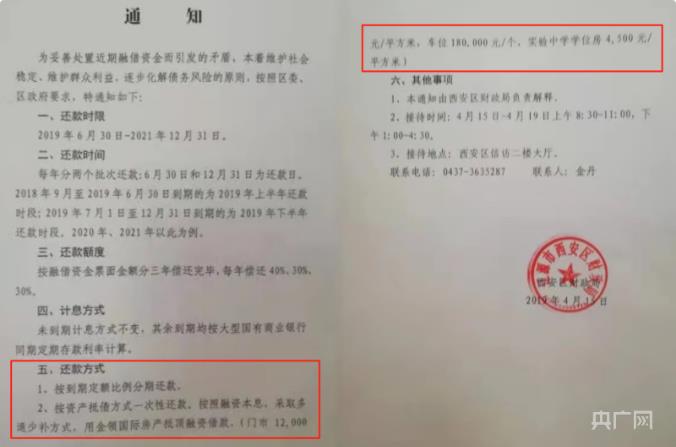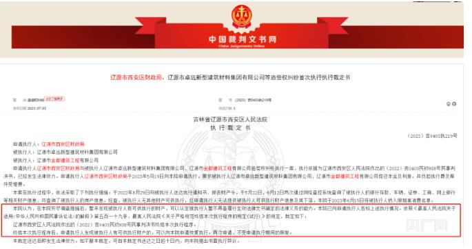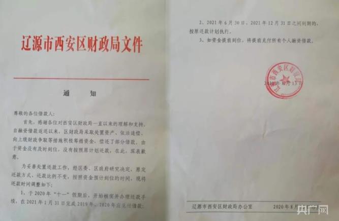 【原标题】记者调查:吉林一区政府项目企业向市民借款未还,钱去哪了? 央广网北京7月17日消息(记者 郭佳丽)近日,吉林省辽源市市民刘强向央广网反映称,5年前,他卖掉房子,借款20万元给辽源市西安区财政局,至今本息难收。 刘强提供的借据显示,上方款项说明处写着“借款(壹年期)”,人民币“贰拾贰万元整”,右下方盖有辽源市西安区财政局的财务专用章。 刘强称,借款时,西安区财政局称利率是10%,还款方式以一年为期,满一年还本付息。如果借款人不支取本金,由区财政局支付利息,本金可逐年滚动续存。“我本想多挣点钱,哪想连本金都要不回来了。” 刘强的钱借给谁了?2021年,辽源市龙山区人民法院发布一则消息称,2017年11月17日,王某某为了响应政府财政局的号召,支持政府的经济发展建设,把钱借给了企业。 在借款到期违约没有还钱的情况下,王某某曾多次找政府讨要借款,因政府无力代偿至今一直未履行还款义务。 6月2日,记者以借款人身份致电辽源市西安区财政局,一名工作人员称,每天都有人找过来,但没有办法,真没钱。其中一家涉事企业负责人称,企业一直配合政府还款,借款肯定会逐步偿还,不必担心。 钱借给谁了? 辽源市市民李勇也在早几年借款给西安区财政局。 他称,2020年,因为亲人生病,他多次到区财政局想要回借款,但财政局说钱是企业借的,应该去找企业要钱。“我也找过企业,但对方表示,他们只跟西安区政府对话。” 记者注意到,李勇提供的借据,正面加盖了辽源市卓远新型建筑材料集团有限公司(以下简称“卓远公司”)财务专用章和辽源市西安区财政局财务专用章。 盖有两个章的借据复印件(央广网发) 企查查信息显示,卓远公司成立于2009年5月15日,注册资本为4500万元人民币。所属行业为非金属矿物制品业,经营范围包含:空心砖、砌块、方砖、路边石、彩瓦、建筑用琉璃制品生产、加工、货物进出口、技术进出口。目前,该公司经营状态为存续(在营、开业、在册)。 企查查信息还显示,卓远公司实际控制人是崔洪铭,持股比例73.3333%,王金成持股比例26.6667%。 此外,卓远公司为辽源市金都建筑工程有限公司大股东(以下简称“金都建筑公司”),持股50.20%。 除卓远公司外,崔洪铭和王金成分别持股金都建筑公司为25.8%和24%。 2022年,吉林省辽源市西安区人民法院一份执行裁定书显示,申请执行人辽源市西安区财政局要求被执行人卓远公司、金都建筑公司偿还欠款及利息。 裁定书还显示,本案在执行过程中,依法采取了下列执行措施:于2022年5月11日向被执行人送达执行通知书、报告财产令。于5月6日、9月19日两次通过网络查控系统查询了被执行人的银行存款、车辆、证券、工商、网上银行等相关财产信息,并查询了被执行人的房产信息。 经查,被执行人无其他财产可供执行,且申请执行人无法提供被执行人可供执行财产信息及其下落,本院于2022年8月16日将被执行人纳入限制高消费名单。 为何无法还款? 2023年6月15日,因卓远公司和金都建筑公司未按执行通知书指定的期间履行生效法律文书确定的给付义务,辽源市西安区人民法院对崔洪铭和王金成下达限制消费令。 2010年,卓远公司曾是辽源市市级大学生就业见习基地。那一年,辽源市人民政府发布的公开文件显示,为全面推进我市“国家级创业型城市”的创建工作,促进以创业带动就业,由县区和有关部门推荐,经市人力资源和社会保障部门考察评定,市政府决定命名辽源矿业(集团)有限责任公司等8个单位为市级大学生就业见习基地。 而金都建筑公司曾被评为“东北区最佳诚信企业”。2012年,某杂志刊发的《从农民工到市劳动模范——记吉林省辽源市金都建筑工程有限公司总经理王金成》文章称,几年来,王金成所承建的大小工程住户满意率达98%以上。每年纳税都在3000万元以上。公司先后被评为“东北区最佳诚信企业”“守合同重信用AAA级单位”,并连年被辽源市委、市政府评为纳税大户。 文章还称,2009年,王金成注册资金2500万元,组建了具有国家二级资质的金都建筑公司。到2012年,公司年产值6亿余元,成为辽源市建筑业的新型骨干企业之一。 记者查阅中国裁判文书网发现,2023年7月5日发布的《辽源市西安区财政局、辽源市卓远新型建筑材料集团有限公司等追偿权纠纷首次执行执行裁定书》显示,在本院穷尽调查措施后,暂未发现被执行人(卓远公司和金都建筑公司)有可供执行的财产,可以认定被执行人暂不具备履行生效法律文书确定的义务的能力。 吉林省辽源市西安区人民法院6月15日发布的执行裁定书(央广网发) 6月30日,王金成对记者表示,当初借款是由政府主导的,企业做的是西安区政府工程项目,相当于政府集资,企业给政府干活。“这几年,由于企业效益也不好、当地政府财政薄弱等原因,导致没按时还钱。” “四五年前,借款人经常给我打电话,我都会给他们解释,但这两年没人打了。”王金成说,现在企业的资产都抵押出去了,政府接过去处理这个事,企业一直配合政府还款,借款肯定会逐步偿还,不必担心。 该如何处理借款? 2021年1月,辽源市西安区人民政府发布的《关于西安区2019年财政预算执行情况和2020年财政预算草案的报告》称,西安区政府始终把化解地方债务风险防控作为首要任务,针对融借民间资金引发的信访隐患,迅速成立政府性债务处置领导小组,综合采取压缩