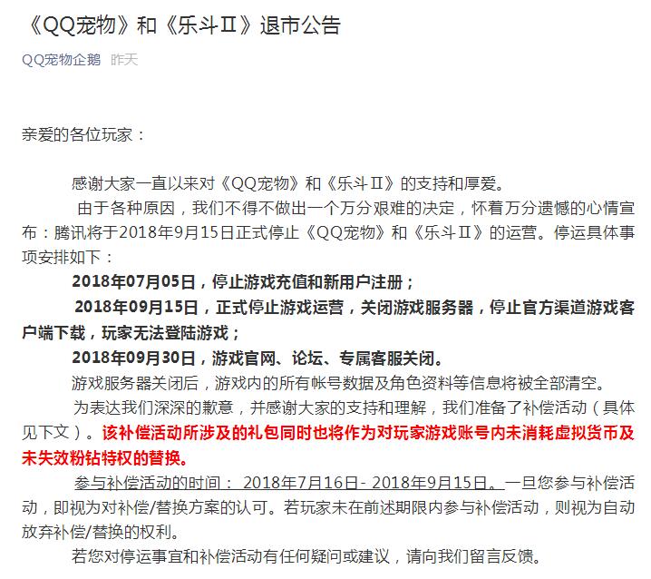 1、腾讯将于2018年9月15日正式停止《QQ宠物》和《乐斗Ⅱ》的运营。