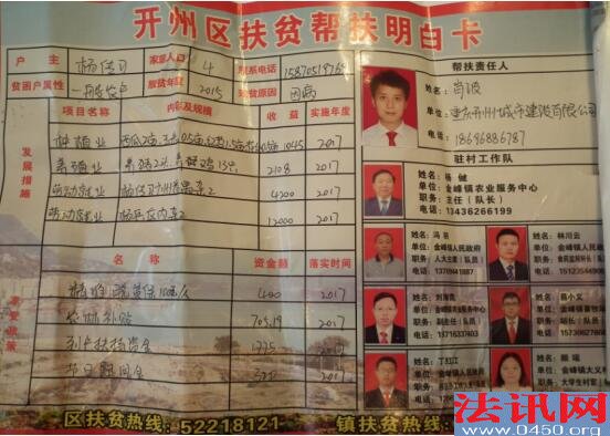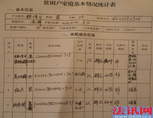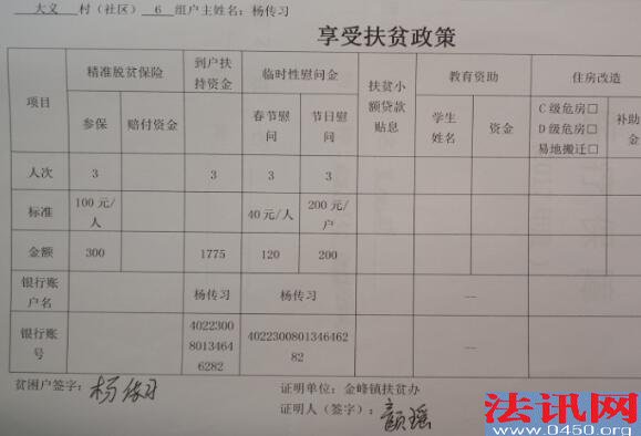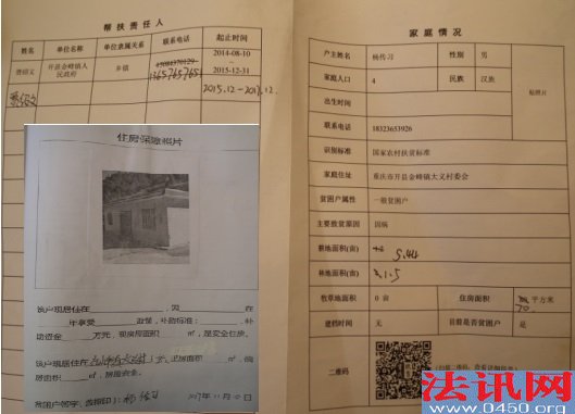 扶贫?重庆开州区金峰镇一贫困户住窝棚无人管! 撰稿人 李堂平 习近平总书记对扶贫工作极其重视,而脱贫攻坚是以习近平同志为核心的党中央作出的重大战略部署,是必须完成的政治任务。就在3月30日,习近平就主持召开今年两会后首次中共中央政治局会议,聚焦脱贫攻坚战。打好脱贫攻坚战是党的十九大提出的三大攻坚战之一,对如期全面建成小康社会、实现我们党第一个百年奋斗目标具有十分重要的意义。对扶贫工作,党中央要求五级书记抓扶贫,层层签订责任书、立下军令状。 但在重庆市开州区金峰镇大义村,如今还有一贫困户没有住所,只有自己搭建一简易棚居住,无水无电...... 心酸!贫困户搭棚而居 这棚,在大热天里能住人么?刮大风下大雨安全么? 17日上午,法讯君【ID:fzkxorg】驱车到达距离开州城区30多公里的大义村6组,在一公路边见到了建卡贫困户杨传习的住所:一不足5平方米的搭建棚。 棚边摆着一小铁锅状的,法讯君以为是熬药所用。杨传习说是他们做饭用的,旁边的塑料桶用于提水,他们吃水得去上面水塘。法讯君看到铁炉下放着一些木棒,水桶里的水不浑浊但颜色泛黄。 不足5平方米的“房间”里,左边摆放着一张1米长的凉床,这是夫妇二人所用。紧挨着床头就是一张条形桌,上面摆放着许多药和碗筷。另一张桌也紧挨着一张桌,就在门口的棚边,桌上放着锅、刀等以及一卷筒纸。桌下也有摆放着一水桶。这个家仅此而已,别说没有电视等电器,就连电都没有。 杨传习告诉法讯君,他们在这居住半月了,虽然就在电线杆下,但他去联系搭电,答复说不能供电。 粗心!建卡贫困户的材料很混乱 在编号为053杨传习的档案里,显示杨传习为2014年申请为贫困户,主要贫困原因是因病:吴地群患风湿病、腰椎盘突出。 杨传习妻子吴地群的特殊疾病医疗证。 她说他们家二人缴纳医保与别人家一样,每年280元,只有今年的医保他们才交每人100元,比非贫困户少交80元。 扶贫档案里显示家庭成员4人,住房面积70平方米(为水库管理房) 在杨传习的贫困档案里,显示其2015年脱贫,家庭成员四人:夫妻二人,儿子杨兵、杨家明。 但实际情况是现在还是建档贫困户,家庭只有夫妻二人:因为家贫无法娶媳妇,儿子杨兵便成为别人家的上门女婿,于2016年迁走户口;至于什么杨家明则没有这个人,只有一个1986年出生的女儿叫杨家燕,在重庆上中专时就迁走户口了,此后一直没有迁回。 但在2017年11月14日填报的《享受扶贫政策》里他的人次为3人 显示2015年脱贫,(这里家庭人口又为4人)虽还在帮扶,但实际上现在依旧一贫如洗哦 其实除了吴地群一直患病,2012年杨传习在开县青少宫处骑车摔倒致颈椎受伤,又花去医药费3万余元,至今钢针都还不能去除,行动不便。 二人靠承包水库养鱼为主要收入,也种些庄稼。这样勉强维持生活。 无奈!承包水库2019年到期,却被撵出管理房 杨传习从2001年开始承包该村的大吉水库用于养殖业,主要养鸭和养鱼。2009年续签承包期后由于政策调整,规定其只能淡水养鱼,不能污染水源。于2017年2月2日到期后又约定延期到2019年3月。 2006年,他花了2万余元在水库边修建了5间房屋,又修建了厕所和猪圈,同时花费5000元申请了供电(买了2根电杆)。占用的是村民土地,每年补偿其240元;之后为方便,他又投资修建从公路到水库的一段公路,每年补偿270元。 这些房屋在2012年因为水库修堤坝被拆除,杨传习没有得到任何补偿。他便在水库边搭棚而居(当时水库补助了杨传习5千元),2014年他搬进了新修建的水库管理房居住。 开县扶贫宣传册有该水库,右侧为管理房,红圈处的棚为杨传习搭建,在这居住2年。 杨传习原有一楼一底8间住房,不包括厨房和猪圈。2011年他办理了复垦,原有176平方米房屋被拆除,他领取了7万余元。当年吴地群患子宫肌瘤和腰椎盘突出,不但用光了这笔钱,还倒欠债6万余元。 2018年3月26日,大吉水库管理中心和杨传习签订协议,确定双方承包合同终止,库中未打捞的鱼由杨传习在2019年3月1前打捞完毕。水库方一次性补偿杨传习未捕捞鱼等所有损失4万元。 该协议第二条约定:“乙方杨传习必须在2018年3月26日前搬出大吉水库管理房,在此期间由乙方杨传习负责水库水质、取水设施安全,期间不允许以任何方式投喂、养鱼。”对此,杨传习称被骗了,当时对方给他打印好的协议是“二0一九年三月一日前搬出大吉水库管理房......大吉水库管理房在二0一九年三月一日交付甲方。” 签订协议后,村支书和水库法人杨文明就拿走了管理房的钥匙,将其撵出。没有住房的杨传习夫妇无奈于第二天在原住房处的公路边搭建了一简易棚居住。 不解!建卡贫苦户得罪村支书后就无法享受政策 对杨传习的情况,有关部门知道情况不?杨传习说帮扶干部知道后来了二次,也向村里反映,村里答复说他是复垦户,不能享受住房。同时还说他不该得罪村支书,解决不了。 原本与村支书要好的杨传习与村支书交恶就源于这个协议。 在杨家不知情的的情况下,杨传习获得这个村委房屋卖与程文明的协议(当时杨父还居住在该房),杨找到村委后才未得逞。 这种扶贫房在大义村修建的很多,基本上是村支书妹夫承包,右边红圈处是正在修建的扶贫房。但这些,均与杨传习无缘...... 4月9日,领到4万元补偿款的杨传习来到金峰镇农商行,用再次向亲友借的4.5万元还清了以其他多位亲友名义借贷的8.8万元贷