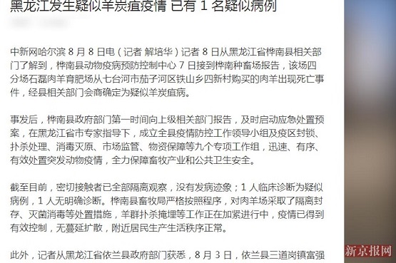 黑龙江发生疑羊炭疽疫情?已捕杀肉羊