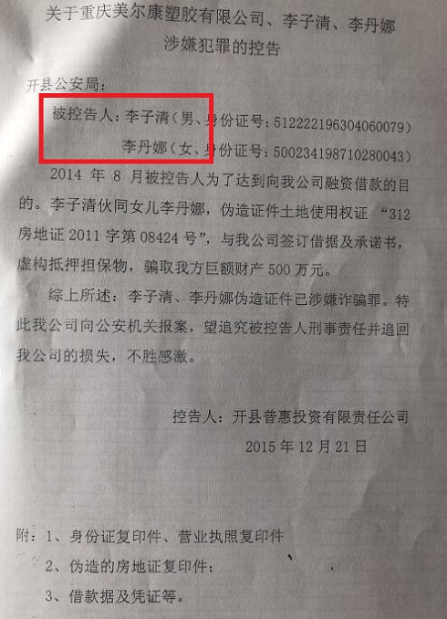 | 涉案3亿,受害人达3000! 重庆市开州区李子清仅被判刑18年引质疑 民呼撰稿人 李海波 李珠维 重庆市开州区的李子清和妻女一起非法集资的钱成立美尔康公司以发展之名骗取250多户3000人及国家3亿余元!而为了骗钱他们多次利用假证将自己房产、股份多次分别抵押或出售他人。他们骗钱花样百出,有谣言引诱、有道具诱骗工有他人配演、有实物配合;受害人多为退休老人。其实他们骗人对象也不分,无论男女老弱、亲戚朋友、新识故旧、贫寒病残,无论是达官贵人或是村组干部,亦或是富豪巨贾或小商小贩、哪怕是捡垃圾的、残疾人工低保困难户、甚至生命垂危的尿毒症癌症患者,一概通吃!就连本公司内部的工人那些养家糊口的钱也被其洗劫! 受害人报案后多次举报投诉近4年后才在诸多事实没有查清的情况下以李子清是投案自首和坦白情节才判刑18年、妻子朱显玉以坦白从轻判刑3年半,作为大股东和另外关联公司法人的女儿以及公司总经理等高管却没有任何责任...... ![]() 高利借贷包装成知名企业 制假证骗钱达3亿挥霍 2004年,李子清成立重庆吉尔塑料有限公司,其实就是一个经营困难的小企业。为了致富,他以技改为幌子,从2008年就开始高息集资。2009年,忠县人姜圣经财务总监蒋宜俊进入公司(据悉此二人均与县里领导有关系)。 2010年6月3日,重庆美尔康塑胶有限公司(以下简称美尔康公司)登记成立,李子清向他人借款一千万元作为美尔康公司的注册资金,登记次日将1千万退还他人。李子清任美尔康公司法定代表人,朱显玉任公司股东及出纳。公司入住赵家工业园区并修建厂房。没钱的李子清便想法四处高息集资,承诺2至6%的月利息。 2013年,美尔康公司将生产餐具的车间分出去成立了重庆独麦瓷器公司,占股75%的李丹娜任法人代表。 2014年9月12日,李子清安排注册开县独到农业科技公司,姜圣投资155万元、朱显峰投资145万元。姜圣为法人。2014年底,资金链断裂的李子清将从银行贷款用于发工人工资和支付货款的250万元转给独到公司,至今没有下落。 胆大包天的李子清一伙还伪造了9本房地产权证、土地证做抵押骗取巨额资金达2千万元以上。 ![]() 2013年,李子清在龙头寺做了一个假房产证给张珠亮,并称将公司和家庭财产做抵押,获得600万元。 这种将自己和公司所有财产抵押的合同比比皆是 2012年,李子清用二本假房产证做抵押向杨生碧借款10万元。2011-2014年,罗玉成借给李子清400万元,称将公司75%的股份和4本房产证抵押。经鉴定有一本为假证。 2014年12月,李子清家人利用假房产证诱骗二人为其贷款担保,之后被银行告上法庭,而庭审时作为被告的李子清一家三人都没有到庭,之后王云科和孟萍的这2套房屋被判拍卖,独麦公司及李丹娜等人承担连带责任。 ![]() 2014年李子清和李丹娜以美尔康公司的名义,制作出虚假的美尔康公司的房产证向普惠投资公司做担保借款650万元,转入其个人账户。普惠公司书面向开县公安局报案,没有处理。 李子清骗钱连老同学也不放过。2014年,他和家人一起向蒋永忠借款450万元,为此将4本房产证做抵押。但此款一到手,他便立即注销了房产证。 ![]() 2014年10月,公司总经理姜圣作为操盘手,以发行原始股票为名,骗取多名受害人达3千万元。 而为了达到侵占受害人财产,2014年至2015年1月李子清及美尔康公司出具假借条虚列债务达千万之上:总经理姜圣虚造债务608万元,财务总监蒋宜俊108万元,周远飞580万元,何文亮160万元! 法院查明:2008年至2015年期间,因美尔康公司成立及扩大生产,被告人李子清、朱显玉在美尔康公司不具备吸收存款资质的情况下,通过自己及他人“口口相传”的方式向社会公开宣传,并承诺付以2%至6%的月利息,向社会不特定公众郭世荣、梁爱红、张弢、李启俊等252人吸收存款242189774元,其中朱显玉参与吸收公众存款38594500元。李子清、朱显玉将吸收的资金用于公司日常运作、投资、支付利息及个人消费。而这些资金仅有1281.7万元进入公司账户,其余全进入了李子清和妻子朱显玉、女儿李丹娜的个人账户里。 这些钱到了李子清手里,是用于发展生产了吗?知情人透露他过着紫醉金迷的生活:保养小三何某,为其买两辆小轿车、在侨城丽景给她买房一套、在重庆观音桥商圈为其投资开文具店一个,另外还给了巨额现金……为此何某为李子清生育了一儿子。 除了向250多人集资外,李子清还向重庆农商行、重庆银行等银行以及贷款机构贷款1亿余元,贷款到手后资金也不入企业账,被总经理姜圣打入外地账号又多次转账,最后进入朱显玉账户。 除了集资3亿多元外,作为其鼓吹是私营企业家的李子清却玩起来侵占公司财产的把戏:在开县税务局虚开设备价款发票入账报销套取资金1千万多元;厂房建设成本每平方750元他报账成1500元,让承建商将多余款项打进他个人账户(检方认定建厂房购置设备金额约4731万元,李朱开假发票报账9000多万元,在年年巨亏的企业里贪污约4000万元);2012-2014年,通过将银行贷款转入业务单位再转入李子清夫妇个人账户贪占企业资金169.83万元和3561.7万元。 2011年到2014年间李子清等以各种欺骗手段,钻国家政策空子,骗取国家各项补助资金1700万元,此款是专款专用,但是他又将其中的800多万元转到李子清的妻子朱显玉卡号上。这1700万元的补助资金,却没有可查去向。 谎言揭穿疑点重重 作为大案重犯的李子清