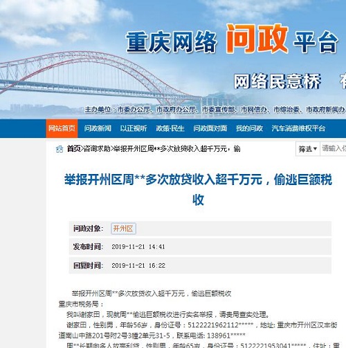 近日,重庆知名企业家向重庆市税务局举报开州区周本玄多次放贷收入超千万元,偷逃巨额税收,昨日在重庆市委办公厅等主办的网络问政平台发布后,开州区税务局当即答复:依法及时进行调查处理。  重庆市税务局: 我叫谢家田,现就周本玄偷逃巨额税收进行实名举报,请贵局查实处理。 谢家田,性别男,年龄56岁,身份证号:5122221962112*****,地址: 重庆市开州区汉丰街道南山中路201号,联系电话: 138961***** 周本玄长期向多人放高利贷,性别男,年龄65岁,身份证号:5122221953041*****,住址:重庆市开州区凤凰城二幢4单元***号,联系电话:156965*****;134362*****;  谢家田向周本玄高利借贷了15次情况 第一笔逃税情况:我从2011年2月28日开始到2015年2月30日止,共向周本玄高利借贷了15次共755万元,从2011年10月19日开始还款或支付利息15次共570.6650万元,这些所得周**没有向贵局申报和缴纳税款吧? 第二笔逃税情况:开州区人民法院(2017)渝0154民初2857号民事判决书显示:2016年12月,周本玄将200万元的谢家田的债权转给李甫能,2015年12月3-2016年12.30利息60万元。这60万元周本玄也没有申报并缴纳税款吧? 第三笔逃税情况:开州区人民法院(2017)渝0154民初3388号民事判决书显示:谢家田偿还周本玄本金884万元,利息从2015年11月起以884万元为基数按年利率24%计算至付清本金之日止。该笔款项我方付给法院1438.8467万元,利息是554.8467万元。 第四笔逃税情况:开州区人民法院(2019)渝02民终885号民事调解书显示:1.谢家田于2019年4月19日前向周本玄支付至2015年9月21日起至2015年12月3日止,以借款本金208万元为基数按月利率2%计算的利息以及至2015年12月4日起至2016年12月6日止以借款本金8万元为基数按月利率2%计算的利息共计120853.34元;2.谢家田于2019年4月19日前向周本玄支付从2015年11月1日起以借款本金25万元为基数,从2015年10月1日起以借款本金83万元为基数、从2015年10月25日起以借款本金200万元为基数、从2017年1月7日起以借款本金8万元为基数均按照年利率24%计算至2018年12月31日止的利息。该调解书已经履行完毕,于今年共向周本玄支付572.3362万元,其中利息是256万余元,周本玄也没有向贵局申报并缴纳税款吧?! 除了本人支付利息其获利1800万元中的偷税,周本玄还有其他人的偷逃利息所得的税款。比如原畜牧局干部万录山向周本玄借款后支付了利息500多万元。周本玄还借给李子清后收了利息300多万元…… 履行纳税义务是每个公民应尽的责任,在此本人特向贵局举办周本玄偷逃税款的违法犯罪行为,敬请贵局查处,并及时反馈给本人相关情况。 举报人:谢家田 联系电话: 138961*****   开州区税务局答复将根据《中华人民共和国税收征收管理法》相关规定,依法及时进行调查处理。