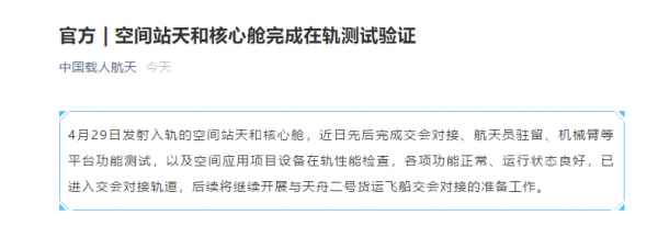 原标题:空间站天和核心舱完成在轨测试验证
