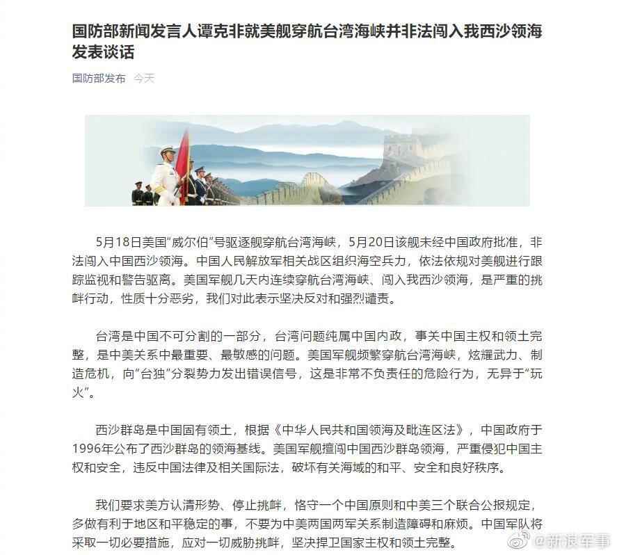 | 原标题:国防部新闻发言人谭克非就美舰穿航台湾海峡并非法闯入我西沙领海发表谈话 ![]() 5月18日美国“威尔伯”号驱逐舰穿航台湾海峡,5月20日该舰未经中国政府批准,非法闯入中国西沙领海。中国人民解放军相关战区组织海空兵力,依法依规对美舰进行跟踪监视和警告驱离。美国军舰几天内连续穿航台湾海峡、闯入我西沙领海,是严重的挑衅行动,性质十分恶劣,我们对此表示坚决反对和强烈谴责。 台湾是中国不可分割的一部分,台湾问题纯属中国内政,事关中国主权和领土完整,是中美关系中最重要、最敏感的问题。美国军舰频繁穿航台湾海峡,炫耀武力、制造危机,向“台独”分裂势力发出错误信号,这是非常不负责任的危险行为,无异于“玩火”。 西沙群岛是中国固有领土,根据《中华人民共和国领海及毗连区法》,中国政府于1996年公布了西沙群岛的领海基线。美国军舰擅闯中国西沙群岛领海,严重侵犯中国主权和安全,违反中国法律及相关国际法,破坏有关海域的和平、安全和良好秩序。 我们要求美方认清形势、停止挑衅,恪守一个中国原则和中美三个联合公报规定,多做有利于地区和平稳定的事,不要为中美两国两军关系制造障碍和麻烦。中国军队将采取一切必要措施,应对一切威胁挑衅,坚决捍卫国家主权和领土完整。 ![]() |