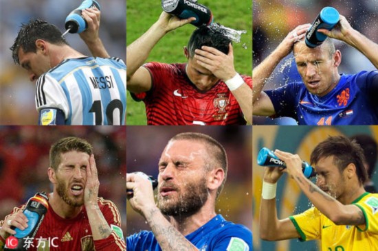 面对高温,球星纷纷选择泼水降温 当然,过高的环境温度,对于短跑运动员来说影响不大,因为毕竟他们的比赛时间非常短。不过可以肯定的是,对于那些中长跑、马拉松,以及足球这一类在室外进行的、比赛时间非常长,且需要考验运动员的耐力、反复冲刺能力的比赛项目参与者来说,高温无疑是他们最大的敌人。 理论上,长时间暴露在高温环境下,运动员的身体会发生如下变化:更加容易疲劳,更加容易感到不舒服;敏感度降低,无法在第一时间感受到周围环境的细微变化;反应变得迟钝;更加容易分心,无法专注于比赛、运动本身;视觉神经功能减退,目力下降;中枢神经更加疲劳,大脑会直接发出信息“命令”肌肉停止收缩。 在最为糟糕的情况下,高温会导致一个人停止呼吸、甚至会导致运动员失去生命。 适应越快,发挥越好? 更加重要的是,一支球队/一队球员在绿茵场上的实际表现,与他们在生理上适应比赛环境温度的程度,直接相关。 回到本文开始的例子:位于南半球的哥伦比亚,此时此刻天气非常寒冷,气温只有8至14摄氏度;北半球的日本则为19至26摄氏度。令人惊讶的是,同样位于北半球的德国,气温居然也只有13至16摄氏度;而中北美国家墨西哥则为14至22摄氏度。 因此,我们有理由相信,更加适应“高温”的日本和墨西哥,在适应比赛环境温度方面,比来自“低温国家”的哥伦比亚和德国更有优势。 运动医学专家已经证明:在同等条件下,环境适应能力更强的足球运动员自身体温更低,这样他们将能够更加专注于比赛;排汗速度更快,汗水中的电解质浓度更低,这有助于阻止球员体内矿物质的流失;皮肤毛细血管内血液流速降低,肌肉功能将因此而变得更强;血容量增加、至少是不会减少,这让球员能够拥有更好的耐力,反复冲刺能力更强。 而倘若无法适应高温,足球运动员很有可能会出现下列症状(当然,严重程度与运动员在炎热环境下暴露的时间、比赛强度等因素直接相关):“热痉挛”,疼痛性痉挛/抽筋、大量出汗、过度口渴;“热衰竭”,极度疲劳、恶心、寒战、头痛;“中暑”,停止排汗、失去意识、昏迷不醒。