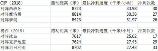 C罗和梅西在本届世界杯小组赛上的跑动数据。点击查看大图 本届世界杯的三场小组赛,梅西和C罗均首发并打满了全场,这也能让我们更加公平的对比双方场上数据。 小组赛的三场比赛中,C罗的跑动距离均超过了8千米,总跑动距离达到了2.596万米。而梅西在三场小组赛中仅有1场跑动距离超过了8千米,总跑动距离2.394万米比C罗少了整整2千米。 虽然C罗的跑动距离要多过梅西,但两人的跑动数据均是大幅低于全队平均水准的: 葡萄牙和阿根廷每场比赛整体平均跑动距离都超过了一万米。 造成这种情况的原因也是由两人的位置和战术作用所决定的,绝代双骄都需要将自己的体能用在最能杀伤对手的时间和区域。 而从最快冲刺速度的数据上看,C罗也是绝对领先梅西。 C罗3场的最快冲刺速度都有超过30千米/小时的纪录,而梅西却没有一次——C罗本身无球跑动爆发力就非常出色,而梅西往往要拿到皮球才更显快人一步。 在冲刺次数上,C罗也要微弱领先于梅西,3场比赛C罗总共冲刺了83次,而梅西为79次。 毕竟,“又当爹又当妈”的踢法,对于两位“三旬老汉”都不容易。