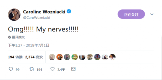 沃兹尼亚奇为丹麦加油,看球的她十分紧张。